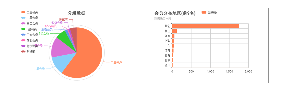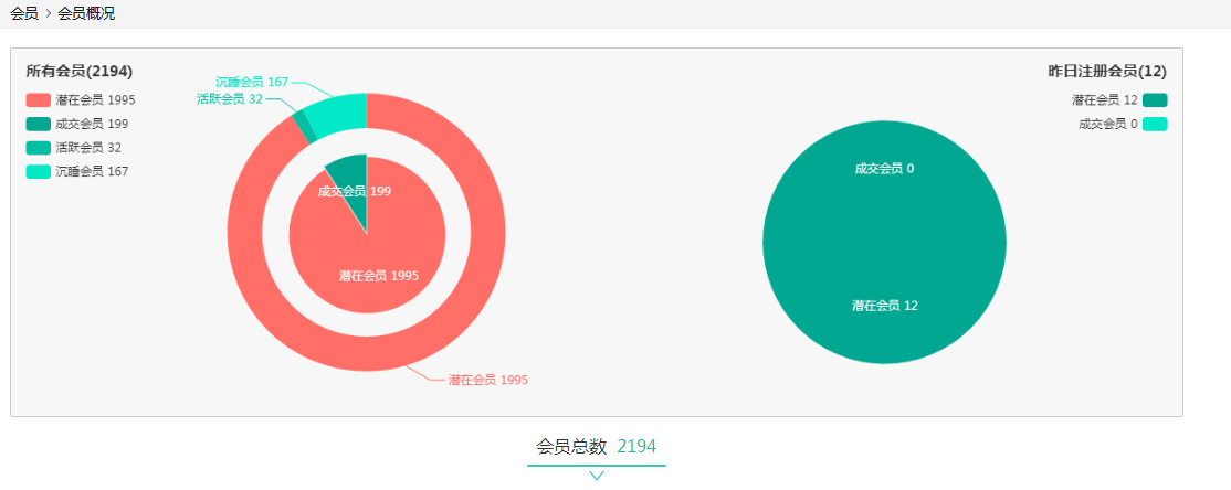 店铺会员的概况:根据成交会员、潜在会员、活跃会员、沉睡会员进行统计,会员分组数据统计,会员分布区域统计。