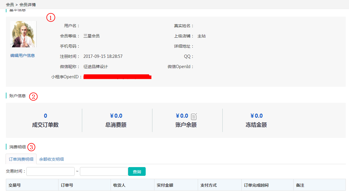 基本信息:会员的基本信息,如此项出现小程序OpenID则说明这个会员是从小程序引流过来;