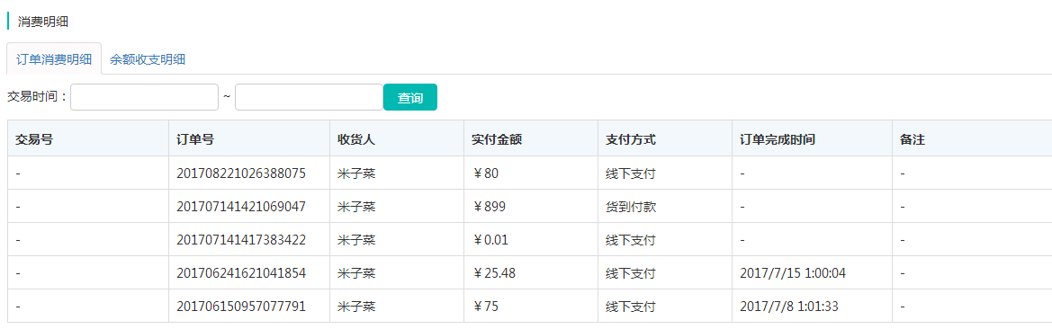 订单消费明细:每笔订单的消费记录可在此查询,可根据交易时间,显示实付金额、支付方式及订单完成时间;