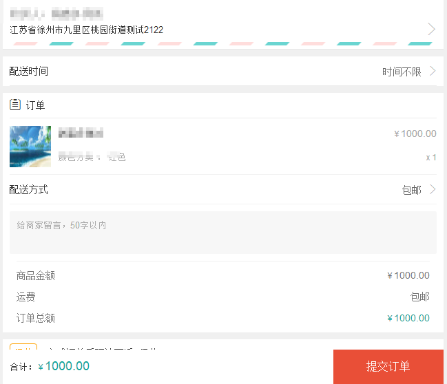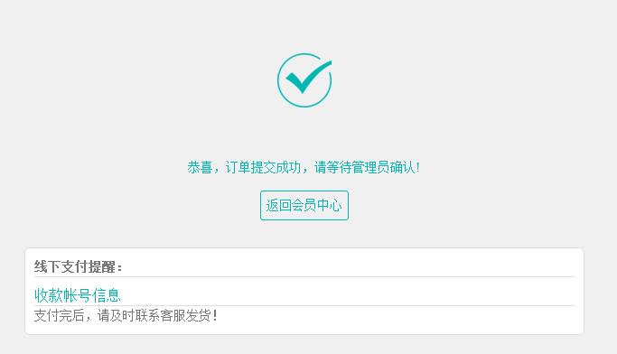 提交成功后支付订单。(注:根据订单付款方式有所不同,以下截图为线下支付方式,没有在线支付的按钮)