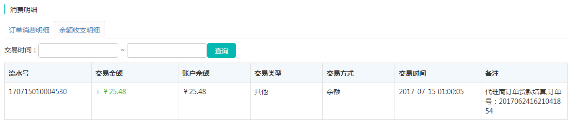余额收支明细:可根据交易时间查询,余额账户的消费与收入情况,备注可显示此交易金额的具体来源。