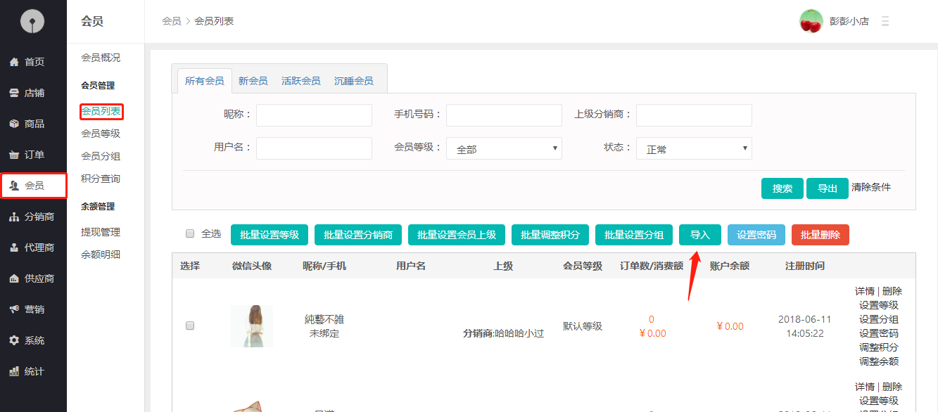 ③ 批量操作:可批量设置会员等级、批量把会员调整成为分销商、批量设置上级(在上级分配错误时可以进行修改上级,需要注意的时修改时不能有未完成的订单)、批量调整积分、批量设置分组、批量删除、设置密码。