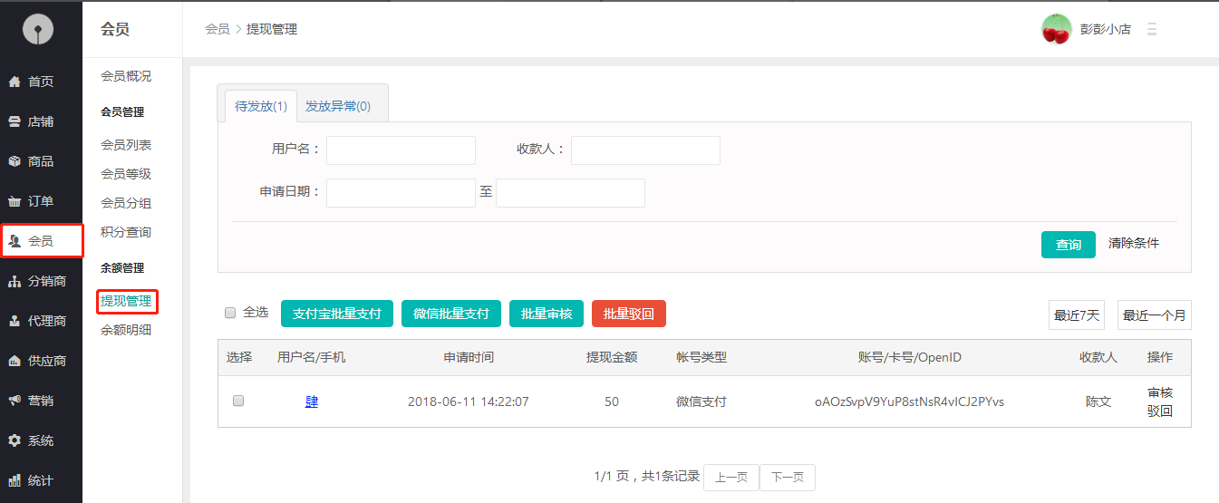 ② 发放状态:可查看待发放和发放异常的提现申请;