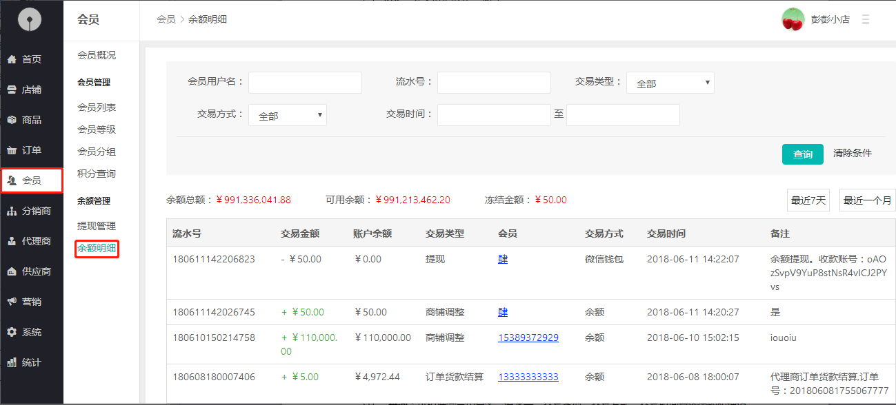 ① 查询:可根据会员用户名、流水号、交易类型、交易方式、交易时间查询余额明细记录