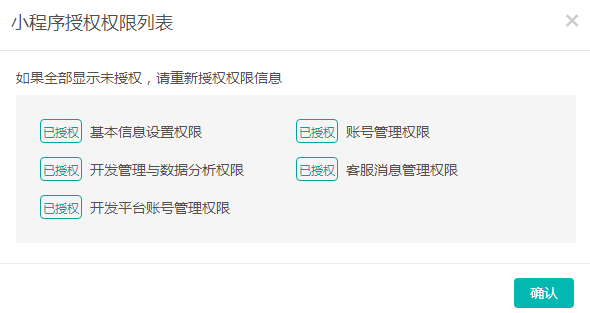 ƒ查看权限:授权后点击查看权限查看小程序授予安菲云平台的权限,权限前面显示已授权代表授权成功,如果权限前面显示未授权则代表小程序没授予安菲云平台该权限;如果全部显示未授权,请重新授权授权信息