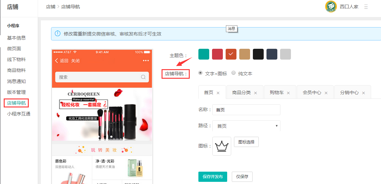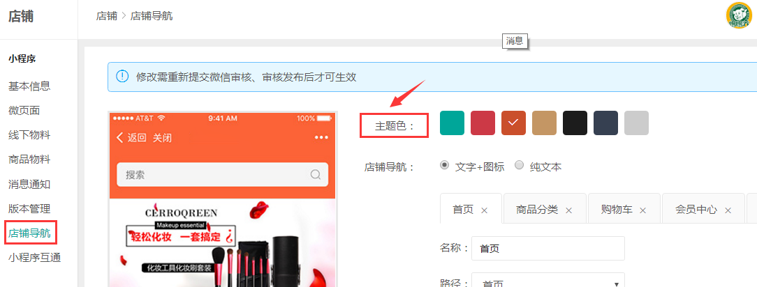 1、注意:修改小程序的店铺导航需要重新上传代码到腾讯去审核,审核通过以后才可以发布最新编辑的导航
