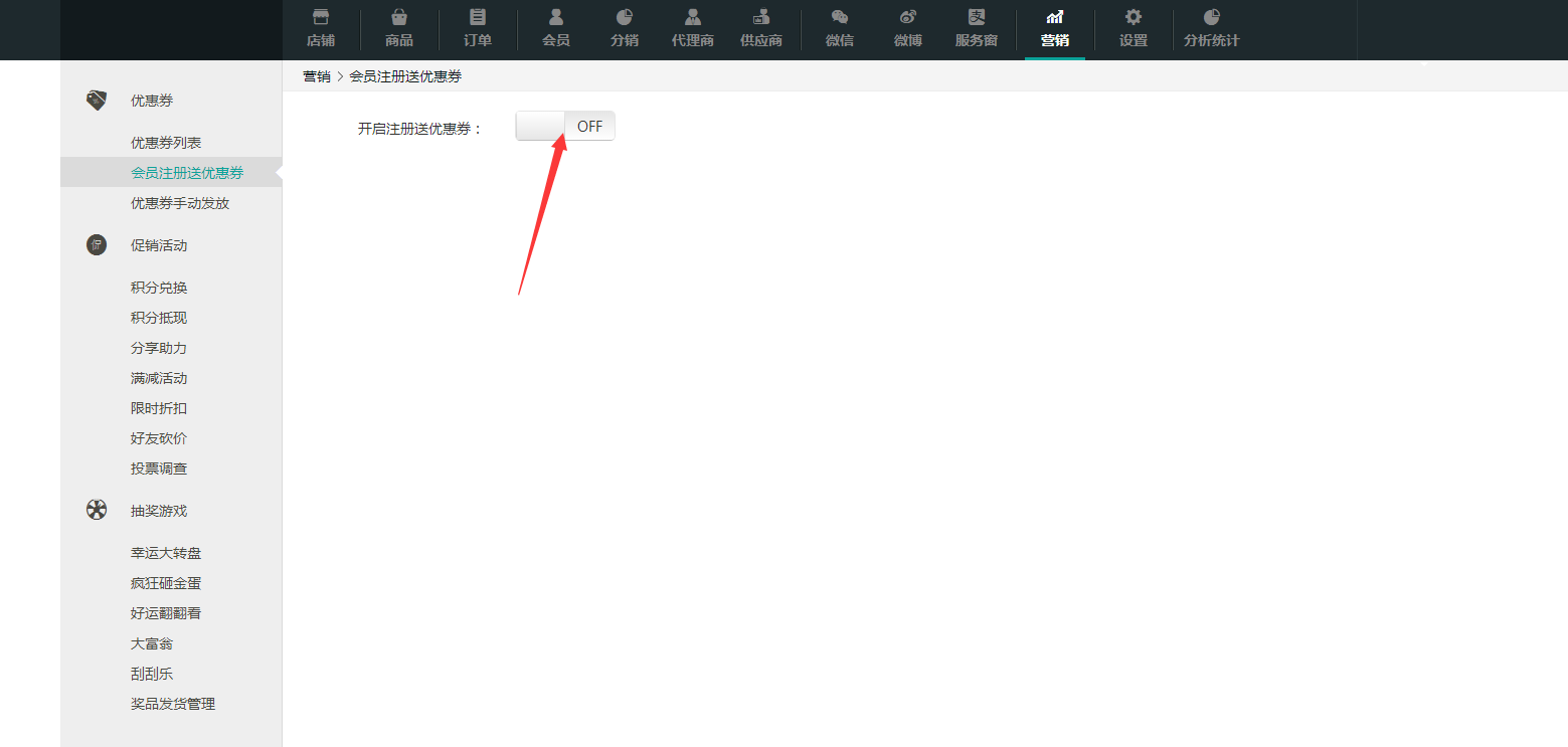 ① 打开“开启注册优惠券”按钮。