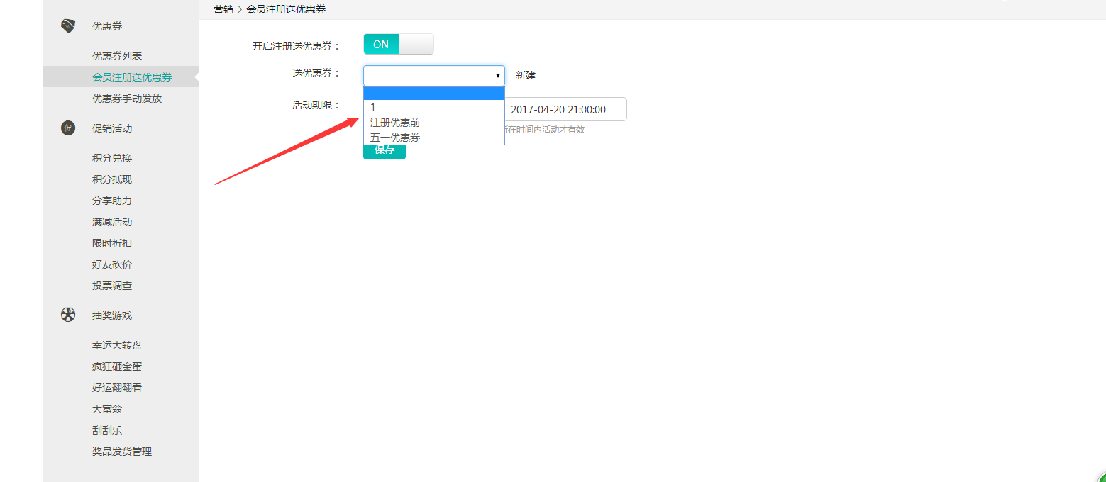 ② 在列表中选择你想要赠送的优惠券,如果没有合适的选项,可以点击旁边的的“新建”按钮添加新的优惠券,操作流程可参照《优惠券管理-如何添加优惠券》。