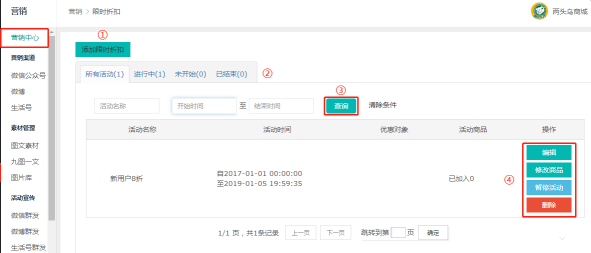 ④ 操作:对活动的编辑、修改商品和暂停活动和删除;