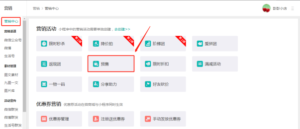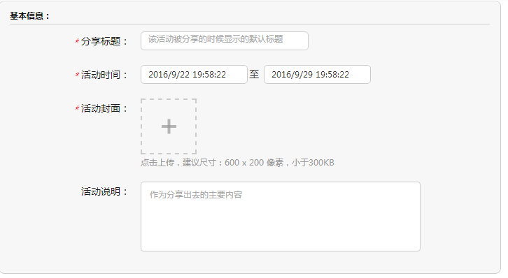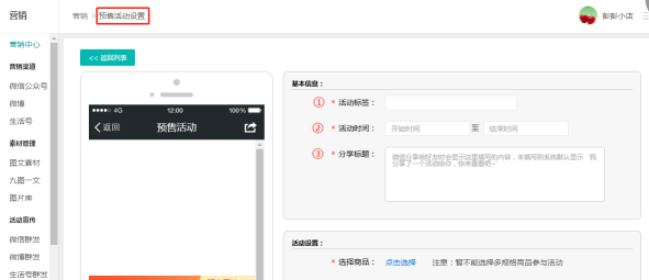 ⑧ 微信昵称或店铺名标签: 在标题和活动介绍中插入微信昵称或店铺名标签,会员在分享到朋友圈的时候可以在相应位置显示其微信昵称或店铺名;