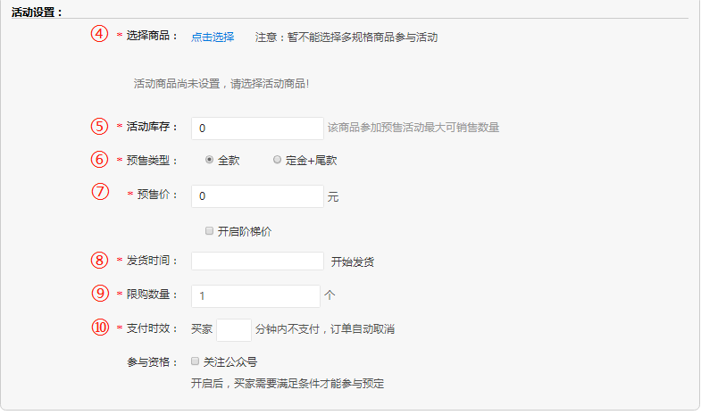⑤ 活动库存:该商品参加预售活动最大可销售数量;