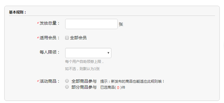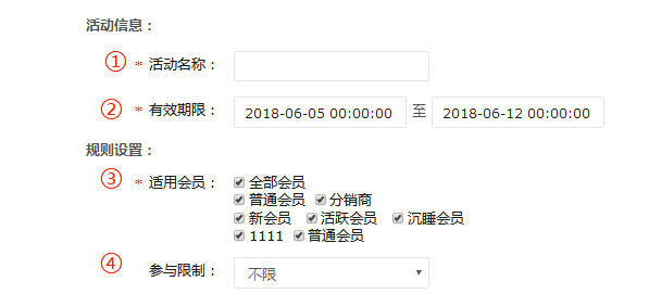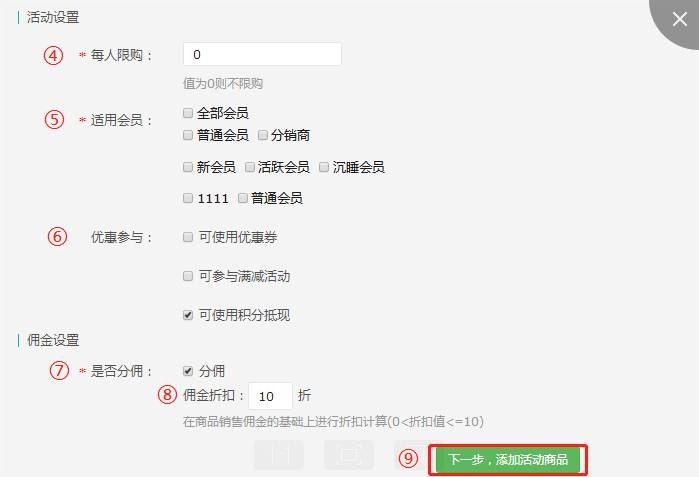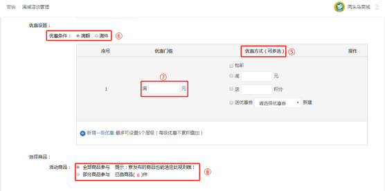 ⑧ 活动商品:可以设置是部分商品参与活动还是商城所有的活动参与活动;