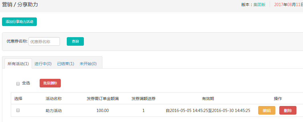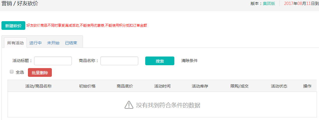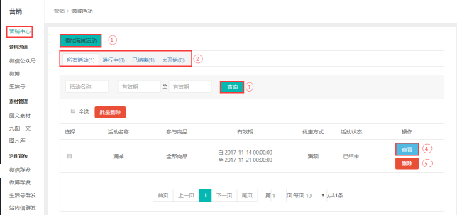 ② 活动状态:查看所有的满减活动,进行中的活动,已结束的活动,未开始的