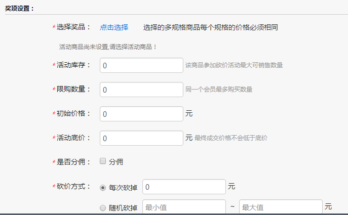 ⑤ 活动奖品:选择商品作为砍价活动的奖品;