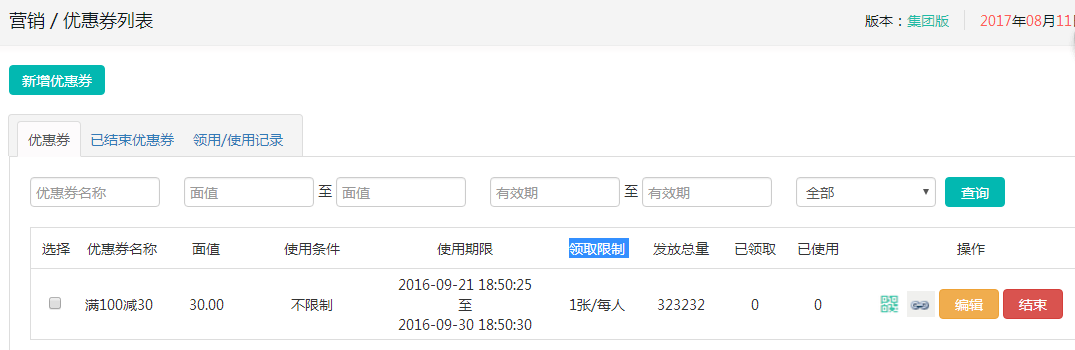 ③ 查询:可根据优惠券名称、面值、有效期查询;