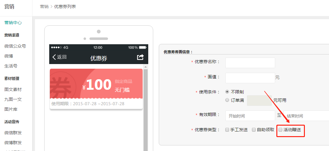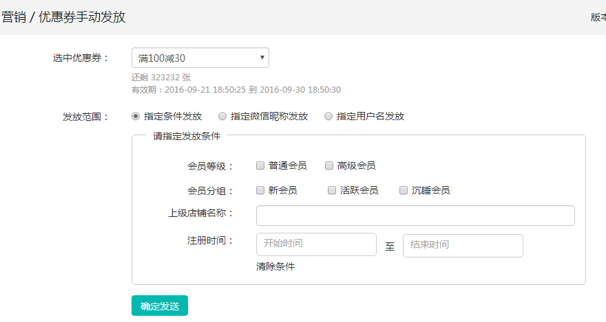 优惠方式的操作:设置减多少元、包邮、送积分、送优惠券,优惠方式可以多选