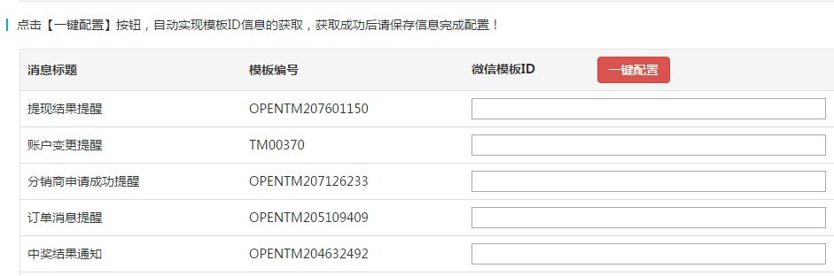 微信开通消息模板后,点击一键配置即可,若未开通消息请参考流程:http://weixin.itokit.com/Help/details/hid/378.html