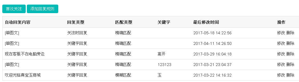 可查看、编辑、新增、删除自动回复的内容。("无匹配回复"仅在未开启多客服设置才生效)