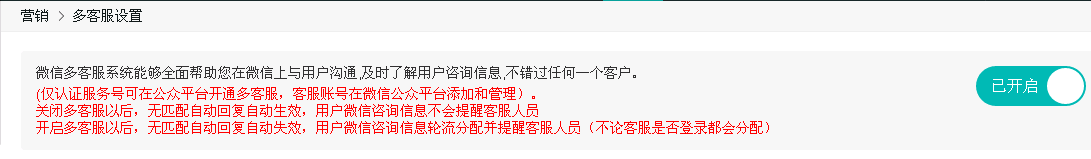 开启多客服以后,无匹配自动回复自动失效,用户微信咨询信息轮流分配并提醒客服人员(不论客服是否登录都会分配)