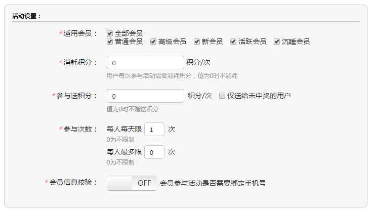 ④ 会员信息校验:开启之后会员参与活动必须绑定手机号