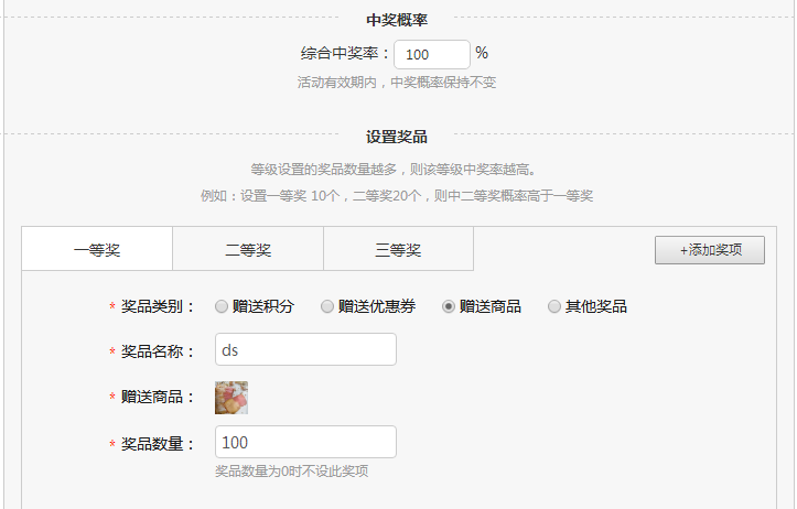 ③ 设置奖品数量:等级设置的奖品数量越多,则该等级中奖率越高。