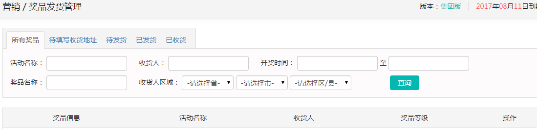 ③ 查询:可通过收货人、成交时间、奖品名称、收货人区域查询;