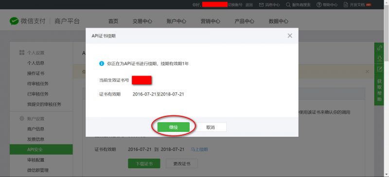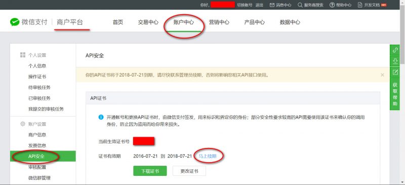 在API证书模块,点击‘马上续期’链接(注意微信api证书续期操作都是在商户平台中,不是公众号后台。)