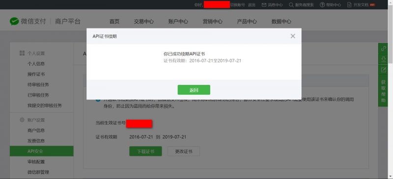 3) 微信api证书续期成功可以看到在证书有效期那里,有效期已经延长一年,之后再点击返回即可。