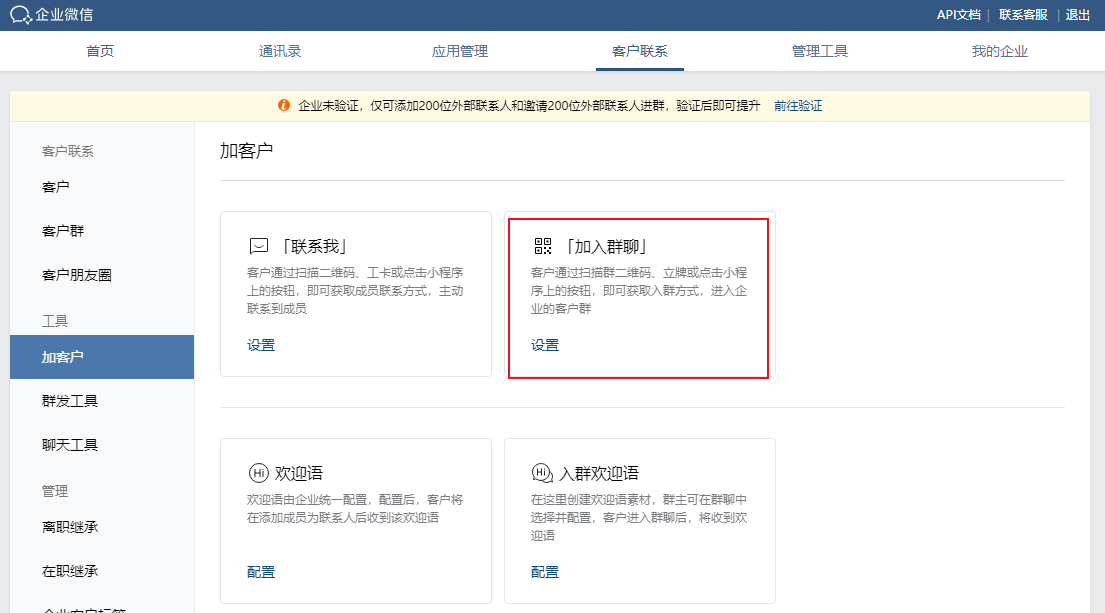 2.如何配置客户联系的加入群聊二维码:配置路径:管理后台-客户联系-加客户-加入群聊。