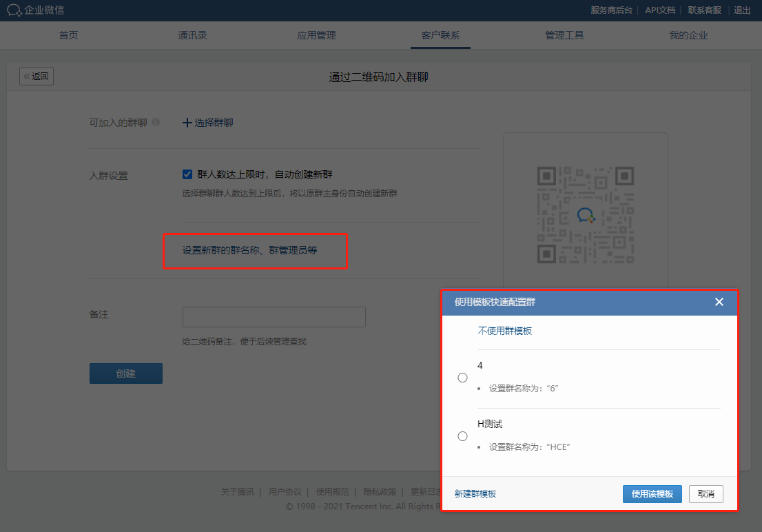 4.新增客户联系加入群聊二维码时能否使用群模板:目前是支持的,在新增客户加入群聊二维码时,可以在入群设置中点击【设置新群的群名称、群管理员等】进行选择对应的群模板,设置后,自动创建的群聊会默认群模板的内容。