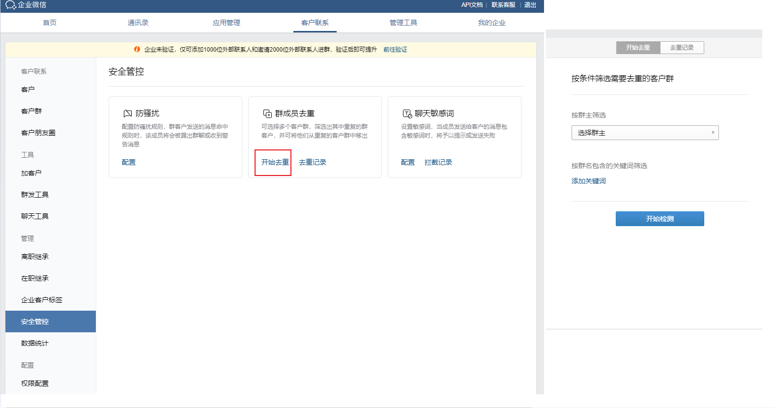 1.群成员去重操作入口:(1)管理后台—客户联系—安全管控—群成员去重—开始去重。(2)客户端—工作台—客户群—群成员去重—企业的客户群去重。