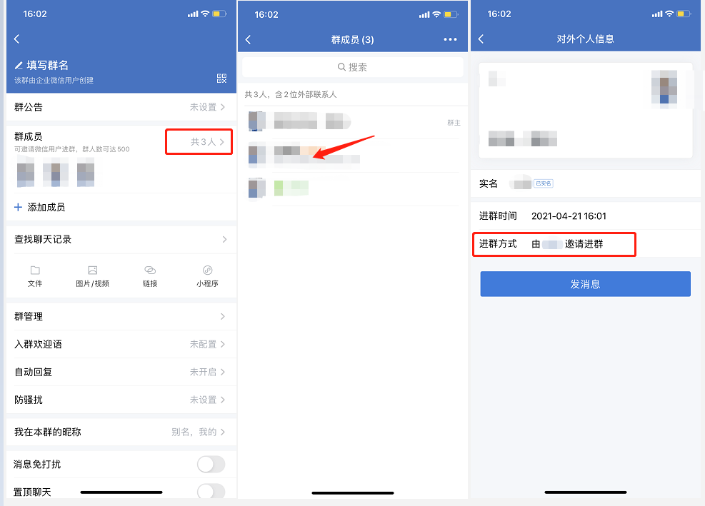 4.客户群中怎么查看群成员的邀请人信息:群主可以在查看非本企业成员的个人资料页面判断对应的群成员的进群方式;进群方式这个入口目前仅客户群的群主查看非本企业的群成员个人资料才能看见;若需获取群内企业成员对应的进群方式,可通过接口获取。