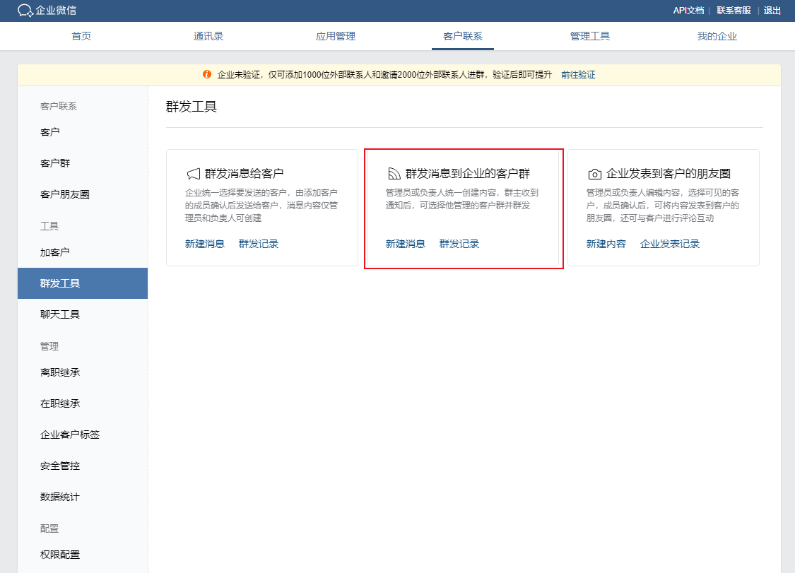 注:每个客户群每个自然日最多能接收来自一名成员的一条群发消息,每个自然月最多接收来自同一企业的管理员或业务负责人的四条群发消息。