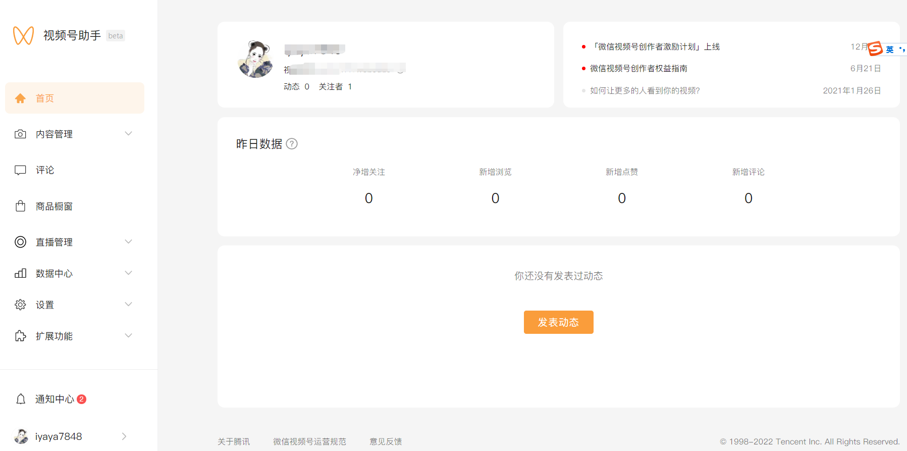 移动端可以再微信搜索“视频号助手”,或者在电脑端搜索打开视频号助手https://channels.weixin.qq.com/,对于视频号的管理手机上可以操作,但是功能有限,其实PC端可以对视频号进行更多管理,如下操作页面: