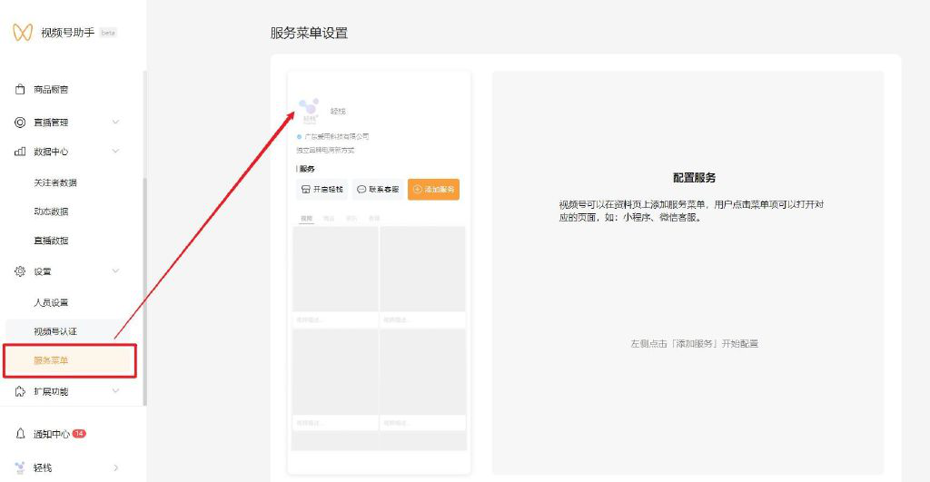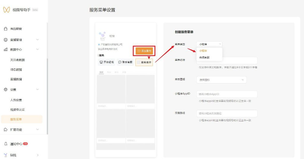 配置服务:视频号可以在资料页上添加服务菜单,用户点击菜单项可以打开对应的页面,如:小程序、微信客服。