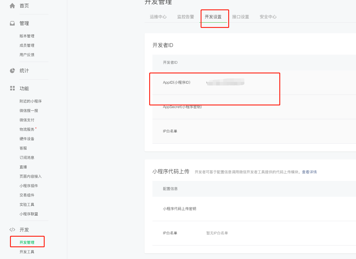 登录公众平台-选择小程序账号邓丽,点击左侧菜单,开发--开发管理--开发设置内查看AppID。